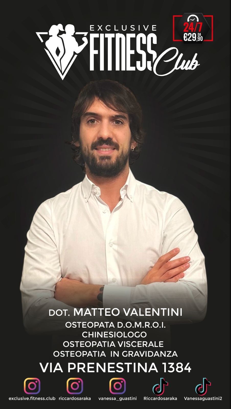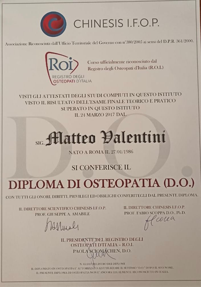 Ciao , sono Matteo Valentini . Sono un osteopata con esperienza decennale specializzato in problematiche muscolo-scheletriche e viscerali . Il mio obbiettivo e’ portare il paziente verso una SALUTE DURATURA . Dopo un attenta valutazione globale del paziente , cercherò di risalire all’ origine del dolore cercando di riequilibrare tutti gli adattamenti che il corpo avrà messo in atto , riportando il corpo verso la guarigione.